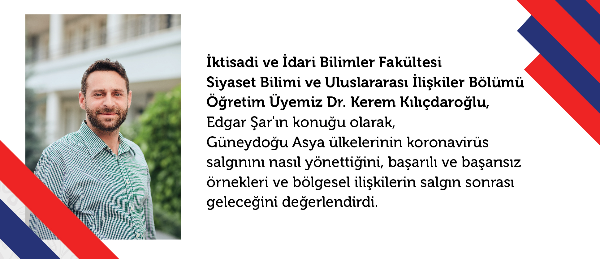 İktisadi ve İdari Bilimler Fakültesi, Siyaset Bilimi ve Uluslararası İlişkiler Bölümü Öğretim Üyemiz Dr. Kerem Kılıçdaroğlu, Edgar Şar’ın konuğu olarak, Güney Doğu Asya ülkelerinin koronavirüs salgınını nasıl yönettiğini, başarılı ve başarısız örnekleri, bölgesel ilişkilerin salgın sonrası geleceğini değerlendirdi.